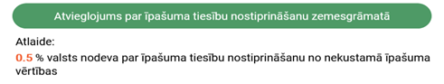 ATLAIDE: 0,5 % valsts nodevai par īpašuma tiesību nostiprināšanu no nekustamā īpašuma vērtības (neuzrādot apliecību – 1,5 %).