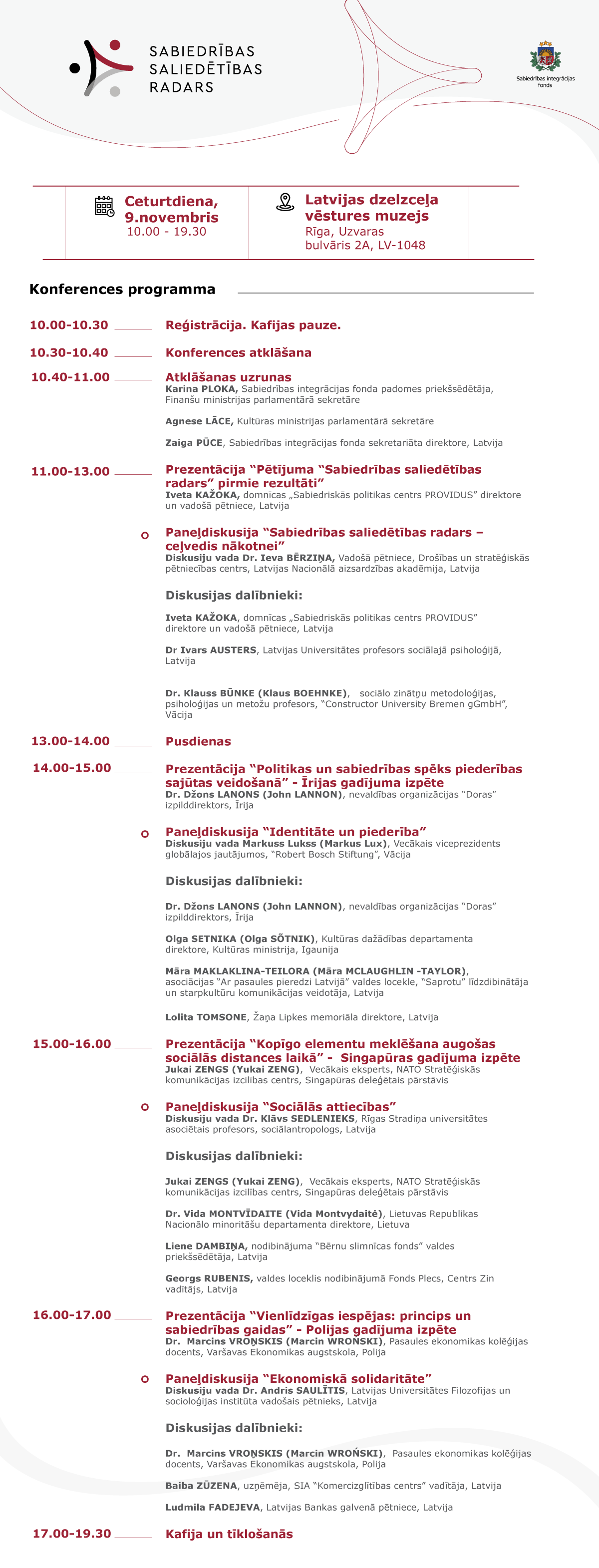 Savukārt paneļdiskusiju laikā dalībnieki aicināti uzklausīt unikālas gadījuma izpētes par situācijām Īrijā, Singapūrā un Polijā, kas palīdzēs tālākās sarunās kopīgi meklēt atbildi uz jautājumu, kā veidot koordinētu starpnozaru sadarbību saliedētas sabiedrības veidošanā. Jautājumos iedziļināsies kā Latvijas, tā Lietuvas, Igaunijas, Polijas, Vācijas, Īrijas, Singapūras un citu valstu publiskā, privātā un akadēmiskā sektora pārstāvji.