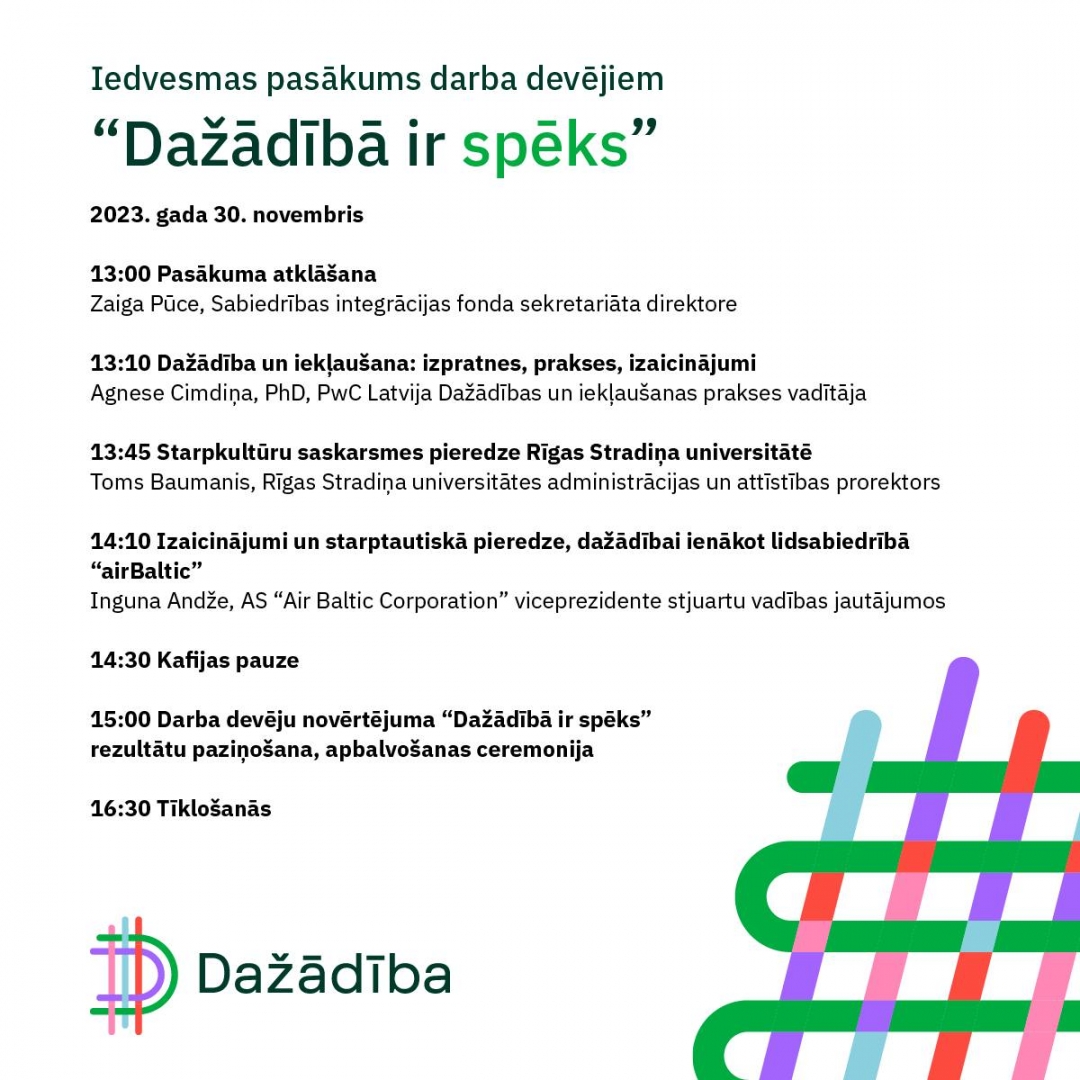 Dažādības iedvesmas pasākumā ar aktualitātēm par dažādības vadības risinājumiem dalīsies eksperte Agnese Cimdiņa, kas iezīmēs situāciju un izaicinājumus dažādības jomā Latvijas uzņēmējdarbības vidē. Savukārt ar pozitīvās un arī negatīvās pieredzes stāstiem dalīsies Rīgas Stradiņa universitātes prorektors Toms Baumanis un airBaltic pārstāvji. Šī gada pasākuma tēma ir uzņēmuma pārvadība multikulturālā vidē, starpkultūru komunikācijas izaicinājumi un iekļaujošas vides veidošana darbiniekiem no dažādām kultūrām. Pasākumu vadīs TV3 moderatore Kristīne Garklāva.